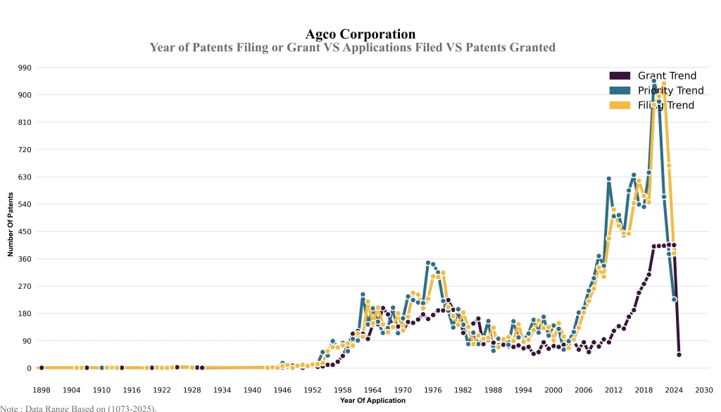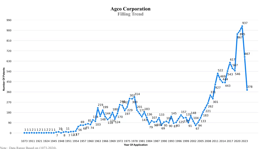 The below graphical representation indicates yearly filing trends of the Agco Corporation, which shows that the number of applications peaked in 2022 with 2023-2024 filings potentially still being recorded, indicating that the trend could rise further.