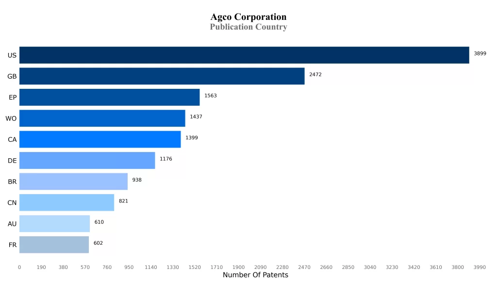 Agco Corporation along with its key subsidiaries has a total of around 17361 patents/applications globally as of the date of the instant publication, out of which 3460 patents have been issued. Of these 17361 patents/applications, more than 33.54% patents/applications are active. United States is where Agco Corporation has filed the maximum number of patents, followed by United Kingdom.