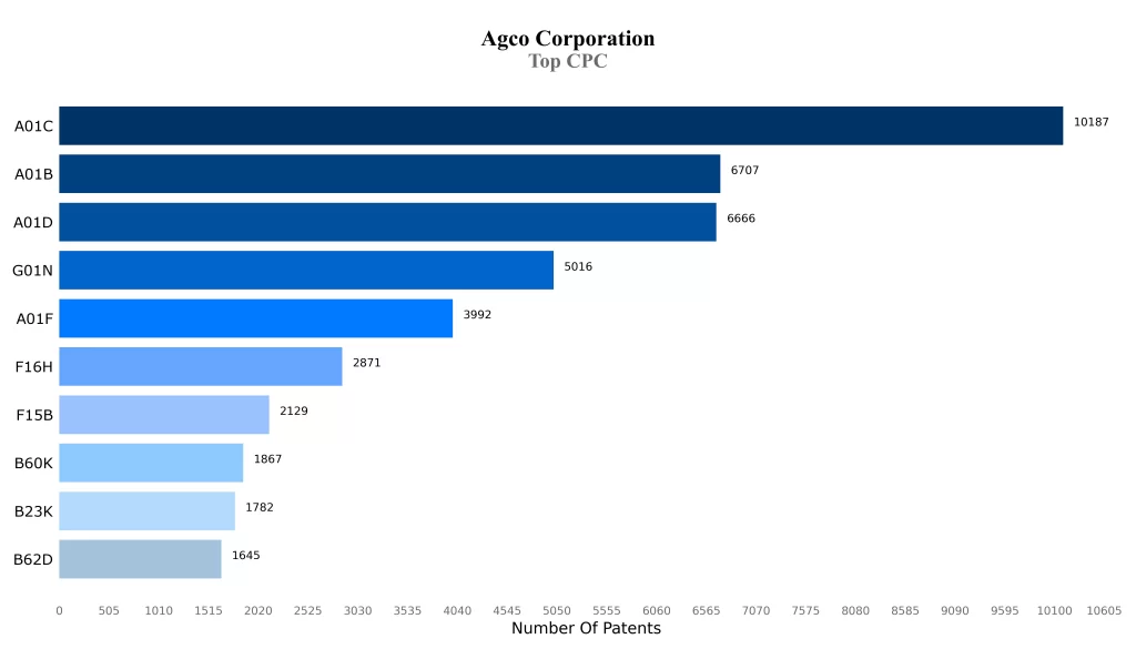 Most of the patents of the Agco Corporation are in the classification of A01C and A01B, which indicates the core areas of technology focus of the company.