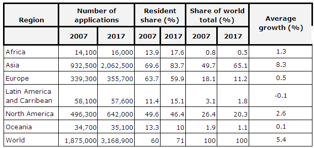 If we look at the number of filings from the year 2007 to 2017, we can calculate the average growth rate, which shows the trends of patent filing in terms of the different regions. As per the “World Intellectual Property Indicators 2018” report, Patent applications filed worldwide reached 3.17 million in 2017.
