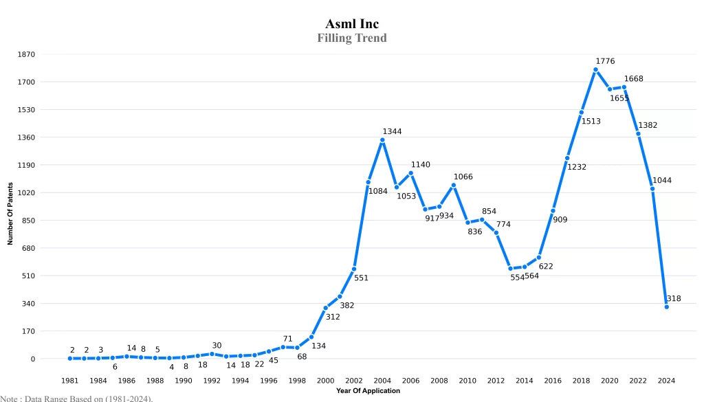 The below graphical representation indicates yearly filing trends of the Asml Inc, which shows that the number of applications peaked in 2019 with 2023-2024 filings potentially still being recorded, indicating that the trend could rise further.