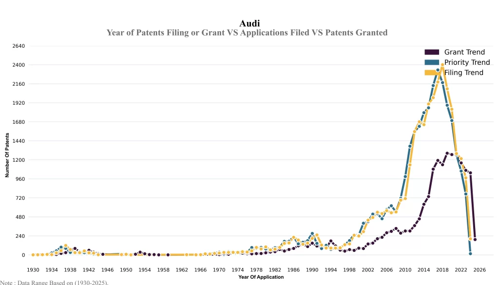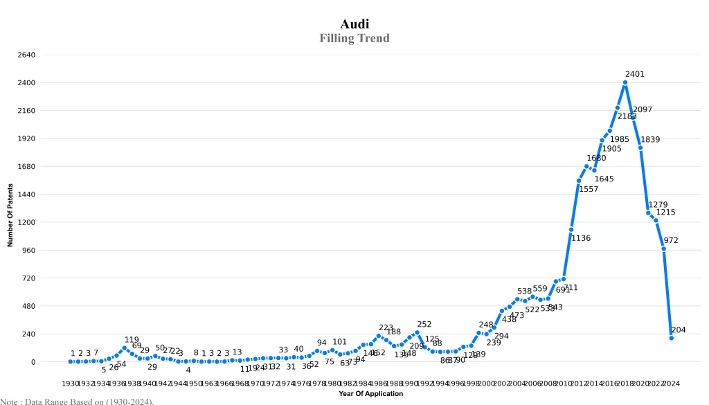 The below graphical representation indicates yearly filing trends of the Audi, which shows that the number of applications peaked in 2018 with 2023-2024 filings potentially still being recorded, indicating that the trend could rise further.
