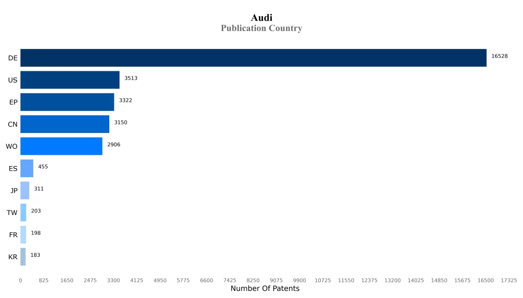 Audi along with its key subsidiaries has a total of around 31384 patents/applications globally as of the date of the instant publication, out of which 9670 patents have been issued. Of these 31384 patents/applications, more than 46.05% patents/applications are active. Germany is where Audi has filed the maximum number of patents, followed by United States.
