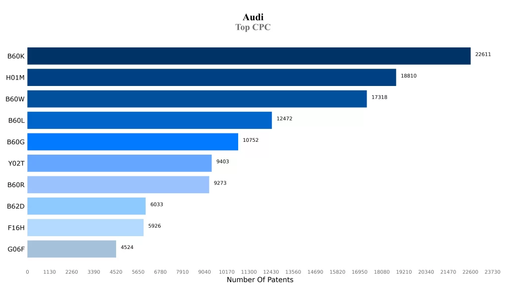 Most of the patents of the Audi are in the classification of B60K and H01M, which indicates the core areas of technology focus of the company.