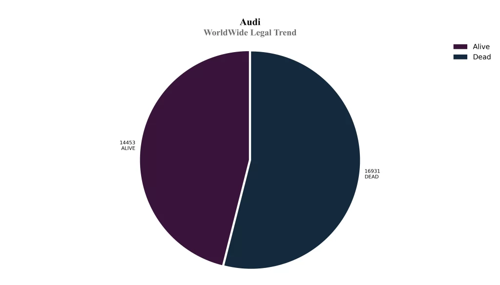 To continue further, Audi has a total of 31384 patents/applications filed globally. These patents/applications belong to 18135 unique patent families. Out of 31384, 14453 patents/applications are active/pending and 16931 patent/applications are inactive.