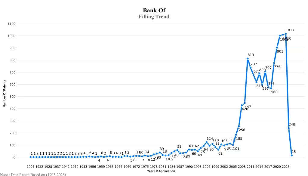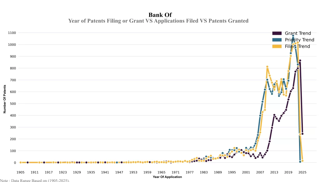 The below graphical representation indicates yearly filing trends of the Bank of America, which shows that the number of applications peaked in 2023 with 2023-2024 filings potentially still being recorded, indicating that the trend could rise further.