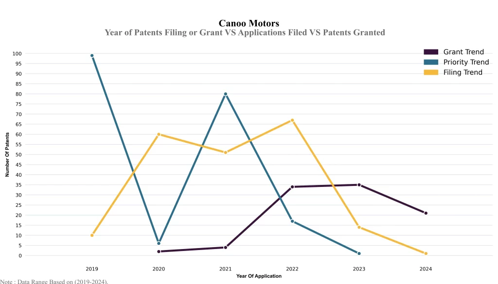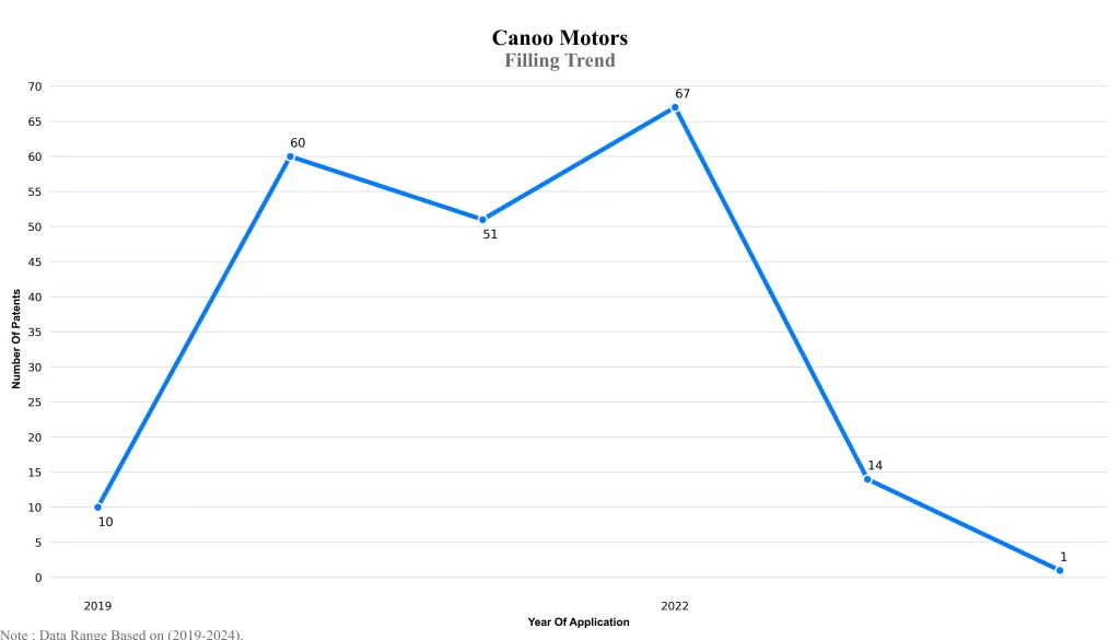 The below graphical representation indicates yearly filing trends of the Canoo Motors, which shows that the number of applications peaked in 2022 with 2023-2024 filings potentially still being recorded, indicating that the trend could rise further.