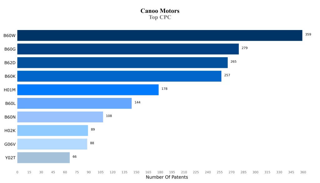 Most of the patents of the Canoo Motors are in the classification of B60W and B60G, which indicates the core areas of technology focus of the company.