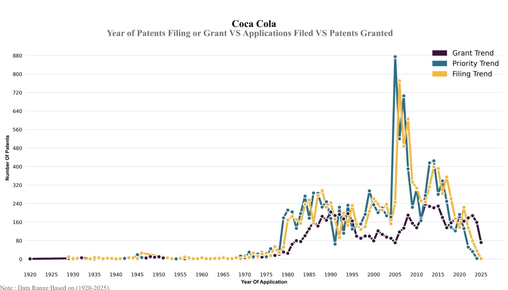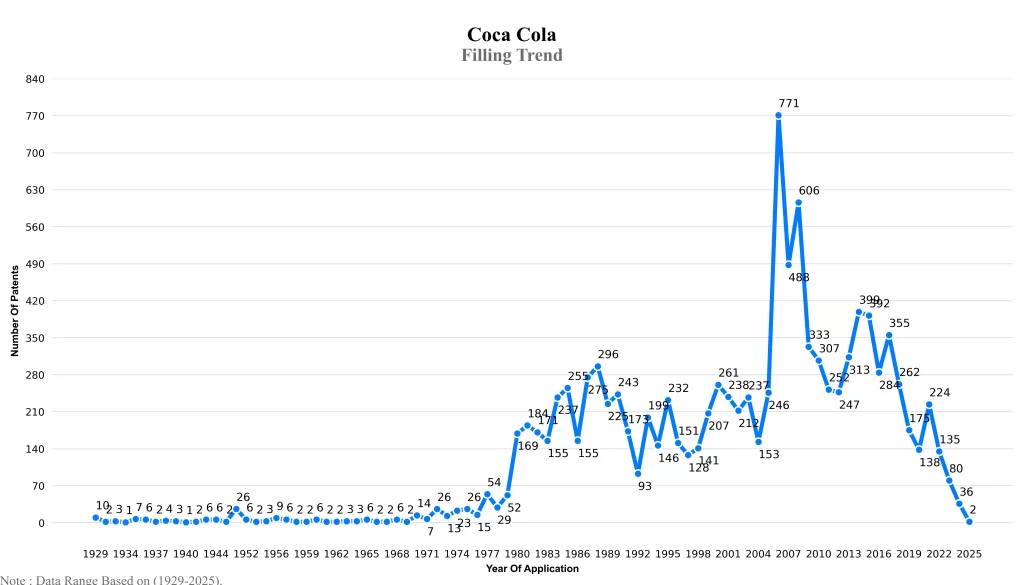 The below graphical representation indicates yearly filing trends of the Coca Cola, which shows that the number of applications peaked in 2006 with 2023-2024 filings potentially still being recorded, indicating that the trend could rise further.