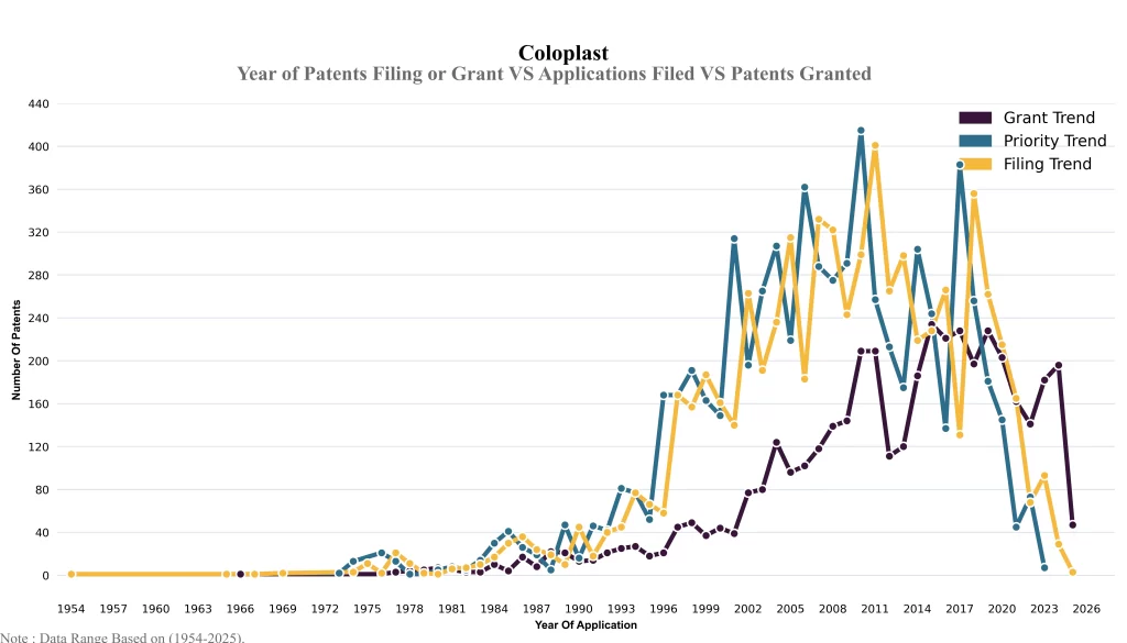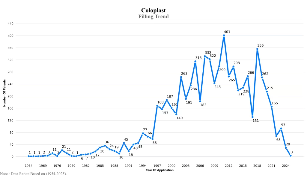 The below graphical representation indicates yearly filing trends of the Coloplast, which shows that the number of applications peaked in 2011 with 2023-2024 filings potentially still being recorded, indicating that the trend could rise further.