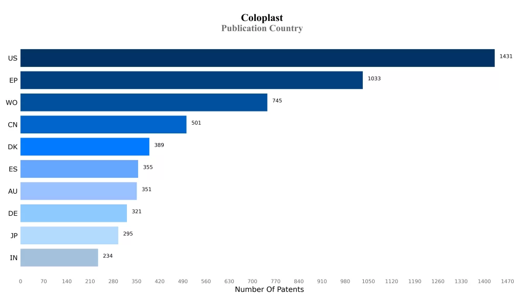 Coloplast along with its key subsidiaries has a total of around 6761 patents/applications globally as of the date of the instant publication, out of which 2170 patents have been issued. Of these 6761 patents/applications, more than 39.82% patents/applications are active. United States is where Coloplast has filed the maximum number of patents, followed by European Patent Office.