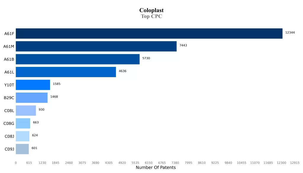 Most of the patents of the Coloplast are in the classification of A61F and A61M, which indicates the core areas of technology focus of the company.
