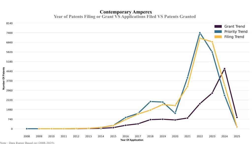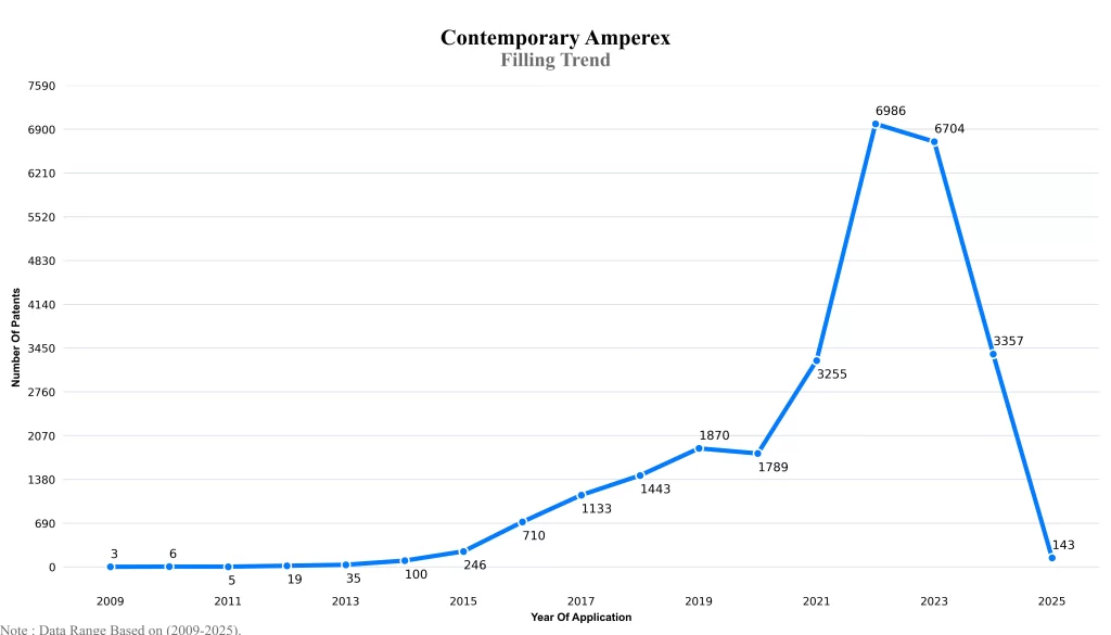 The below graphical representation indicates yearly filing trends of the Contemporary Amperex, which shows that the number of applications peaked in 2022 with 2023-2024 filings potentially still being recorded, indicating that the trend could rise further.