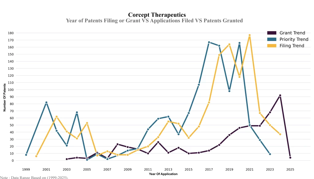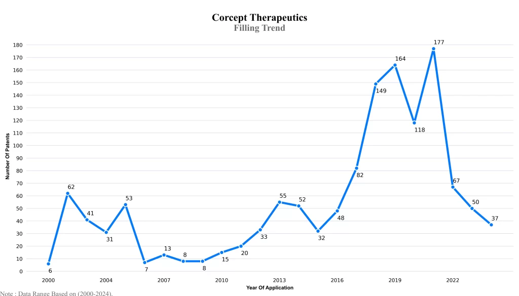 The below graphical representation indicates yearly filing trends of the Corcept Therapeutics, which shows that the number of applications peaked in 2021 with 2023-2024 filings potentially still being recorded, indicating that the trend could rise further.
