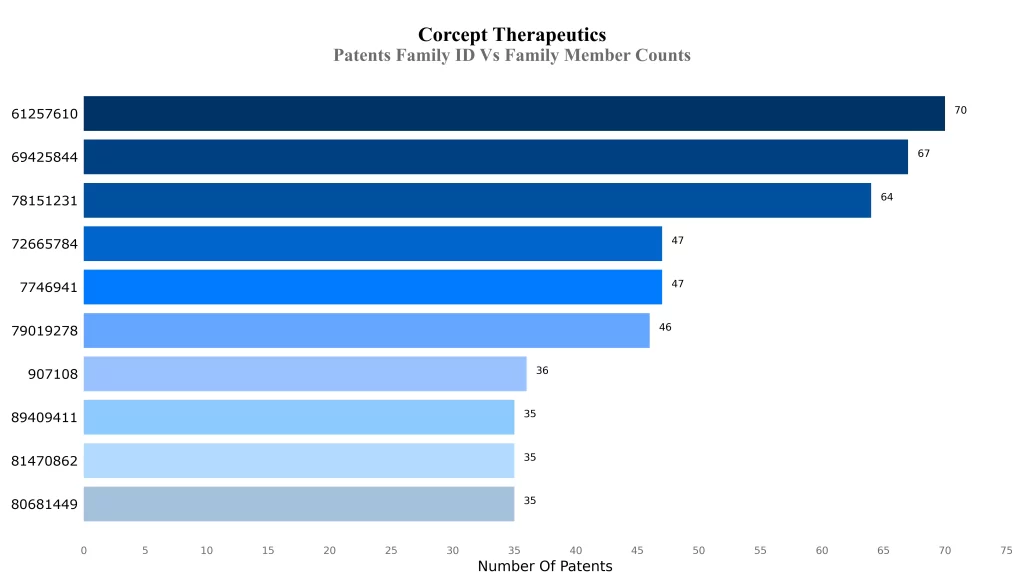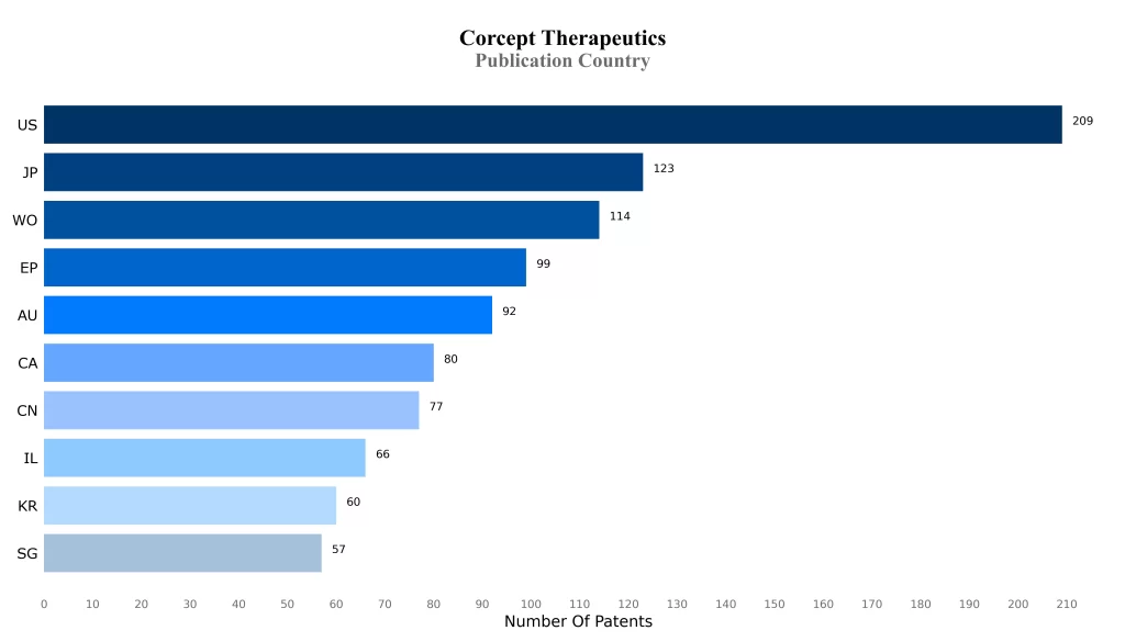 Corcept Therapeutics along with its key subsidiaries has a total of around 1328 patents/applications globally as of the date of the instant publication, out of which 439 patents have been issued. Of these 1328 patents/applications, more than 67.62% patents/applications are active. United States is where Corcept Therapeutics has filed the maximum number of patents, followed by Japan.