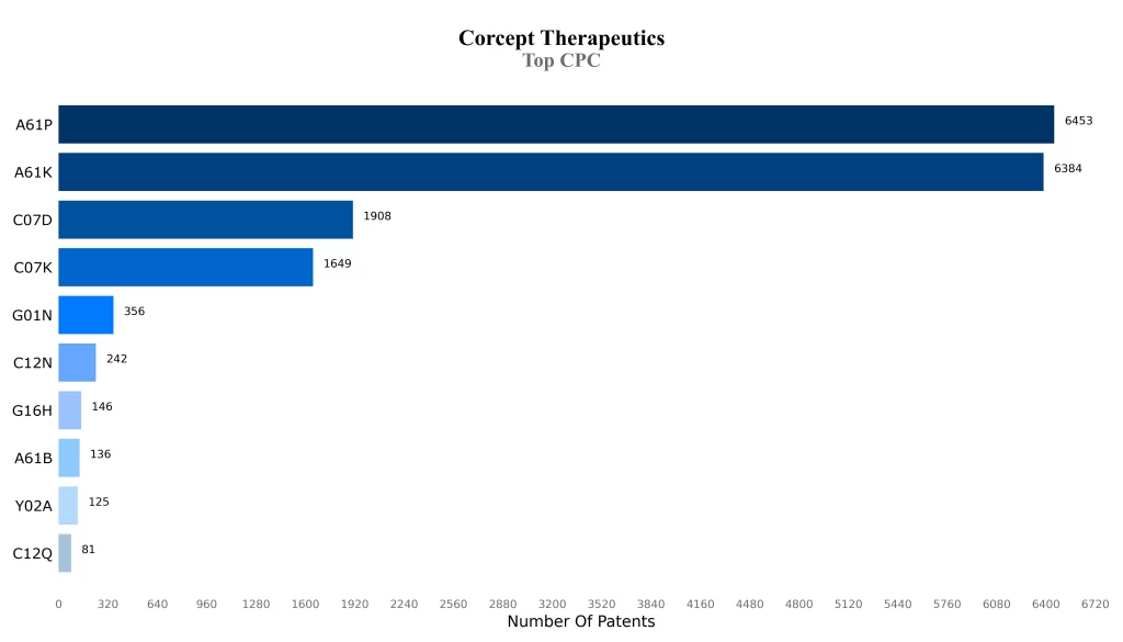 Most of the patents of the Corcept Therapeutics are in the classification of A61P and A61K, which indicates the core areas of technology focus of the company.