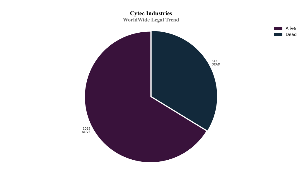 To continue further, Cytec Industries has a total of 1608 patents/applications filed globally. These patents/applications belong to 212 unique patent families. Out of 1608, 1065 patents/applications are active/pending and 543 patent/applications are inactive.