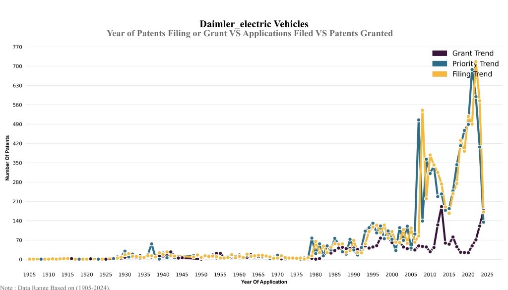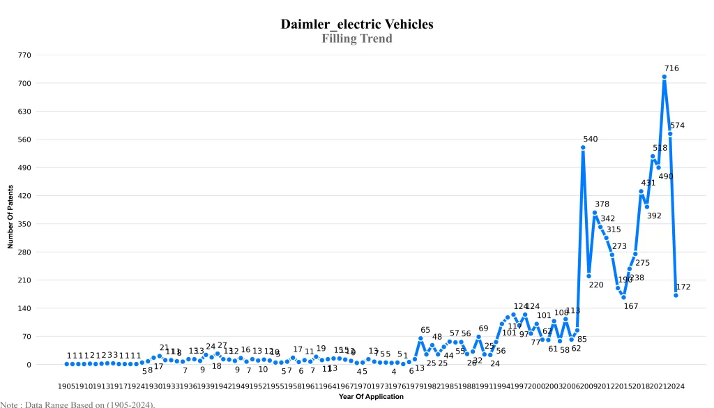 The below graphical representation indicates yearly filing trends of the Daimler_electric Vehicles, which shows that the number of applications peaked in 2022 with 2023-2024 filings potentially still being recorded, indicating that the trend could rise further.