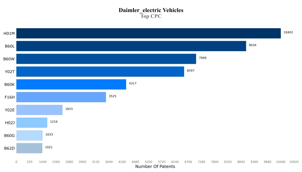 Most of the patents of the Daimler_electric Vehicles are in the classification of H01M and B60L, which indicates the core areas of technology focus of the company.