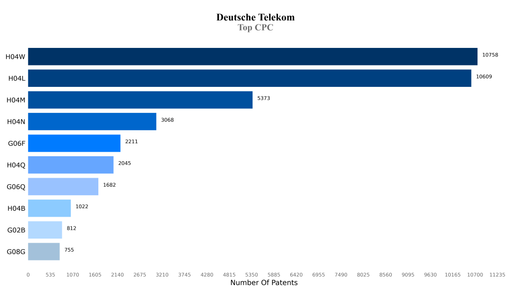 Most of the patents of the Deutsche Telekom are in the classification of H04W and H04L, which indicates the core areas of technology focus of the company.