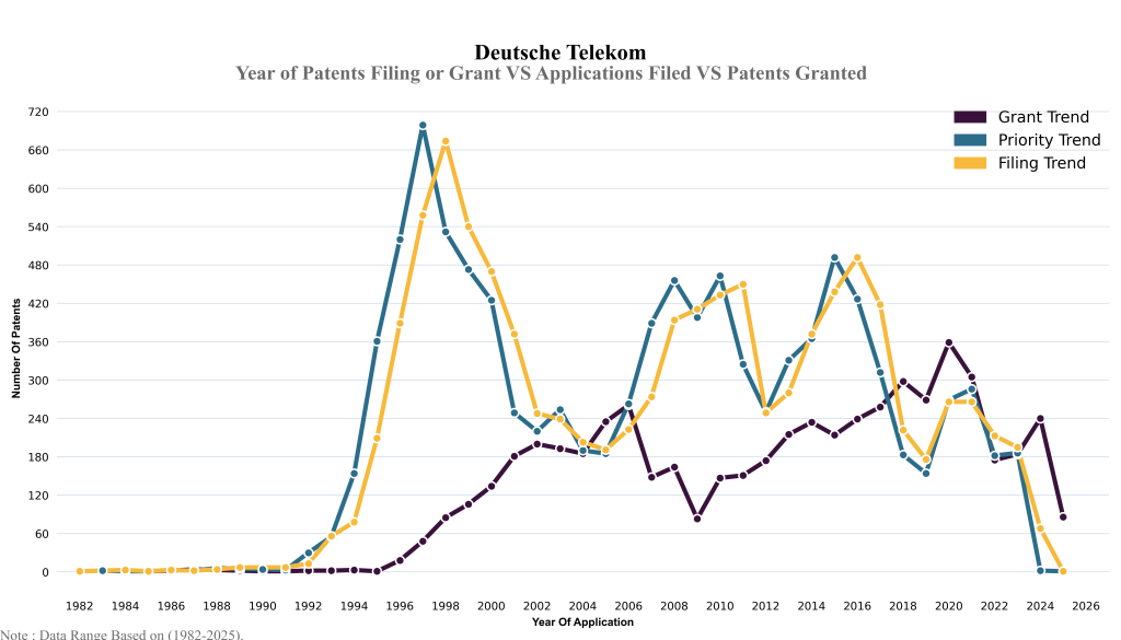 The below graphical representation indicates yearly filing trends of the Deutsche Telekom, which shows that the number of applications peaked in 1998 with 2023-2024 filings potentially still being recorded, indicating that the trend could rise further.