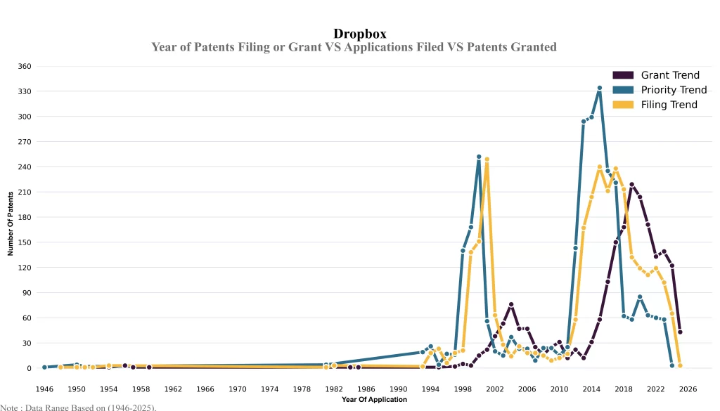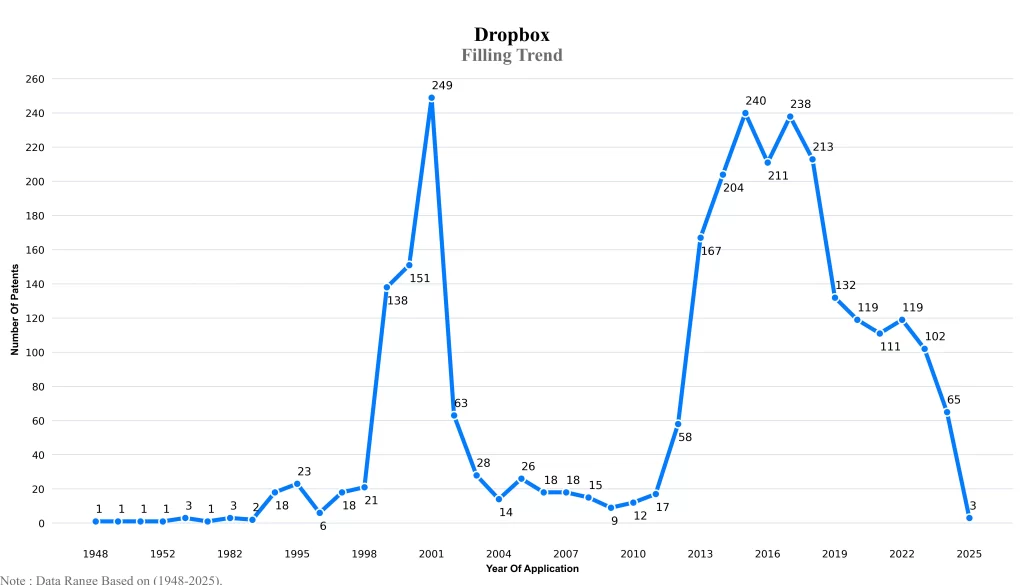 The below graphical representation indicates yearly filing trends of the Dropbox, which shows that the number of applications peaked in 2001 with 2023-2024 filings potentially still being recorded, indicating that the trend could rise further.