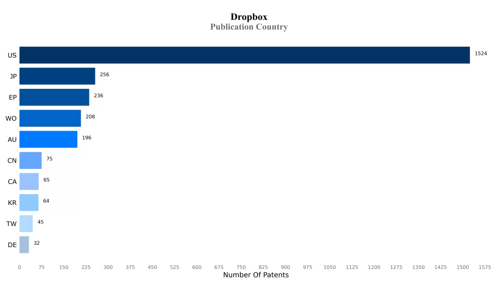 Dropbox along with its key subsidiaries has a total of around 2839 patents/applications globally as of the date of the instant publication, out of which 1592 patents have been issued. Of these 2839 patents/applications, more than 62.42% patents/applications are active. United States is where Dropbox has filed the maximum number of patents, followed by Japan.