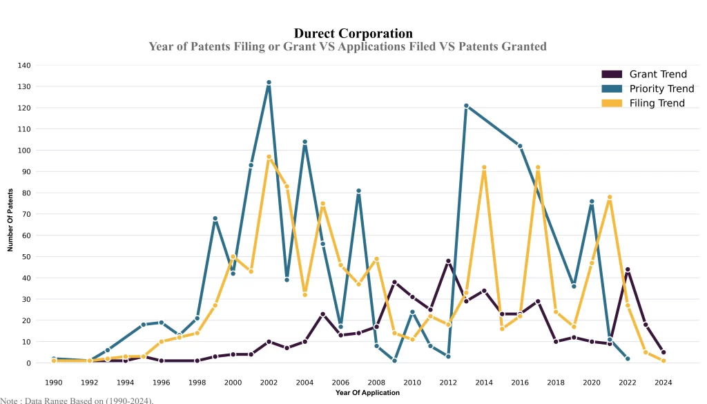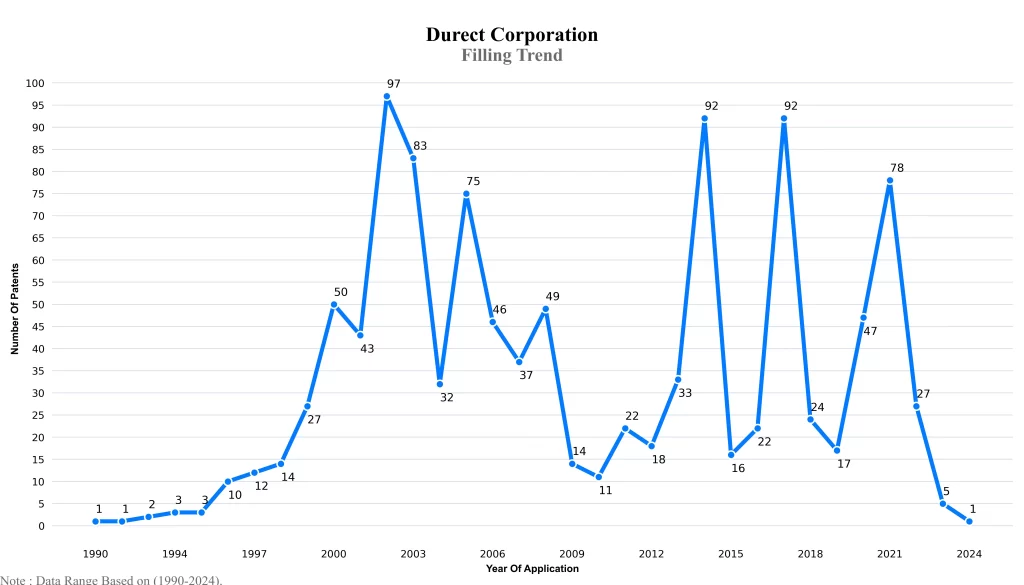 The below graphical representation indicates yearly filing trends of the Durect Corporation, which shows that the number of applications peaked in 2002 with 2023-2024 filings potentially still being recorded, indicating that the trend could rise further.