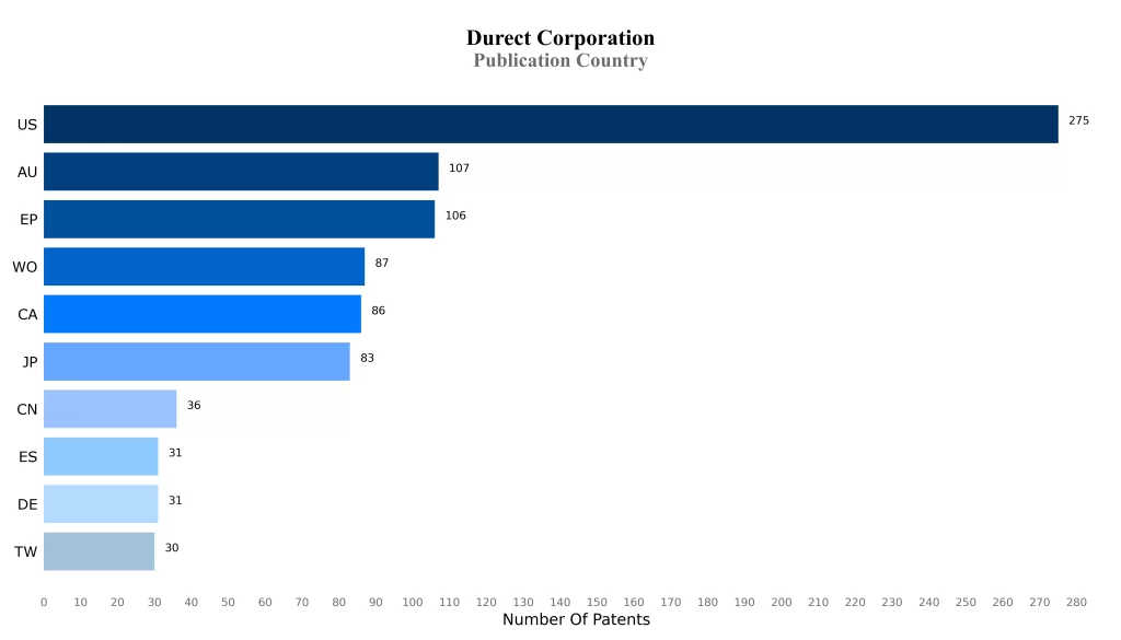 Durect Corporation along with its key subsidiaries has a total of around 1104 patents/applications globally as of the date of the instant publication, out of which 131 patents have been issued. Of these 1104 patents/applications, more than 24.73% patents/applications are active. United States is where Durect Corporation has filed the maximum number of patents, followed by Australia.