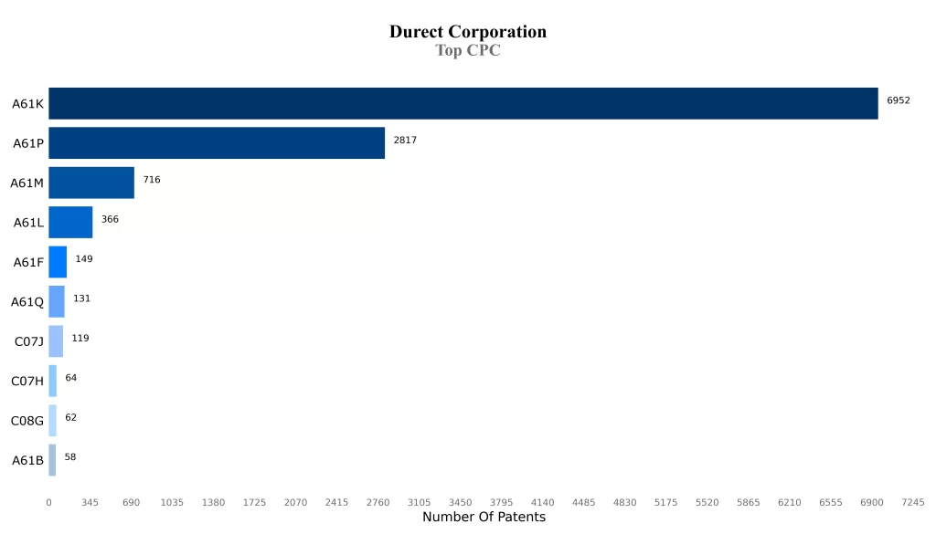 Most of the patents of the Durect Corporation are in the classification of A61K and A61P, which indicates the core areas of technology focus of the company.