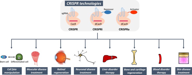 CRISPR, an acronym for Clustered Regularly Interspaced Short Palindromic Repeats (CRISPR), and this is usually done by the use of an enzyme called Cas9, there CRISPT-Cas9. CRISPR-Cas9 system has revolutionized the field of gene editing, facilitating efficient genome editing by the creation of targeted double-strand breaks of almost any organism and cell type. CRISPR-Cas9 technology has been especially useful in gene therapy fields and has also been used for regulation of endogenous gene expression, epigenome editing, live-cell labeling of chromosomal loci, edition of single-stranded RNA, and high-throughput gene screening.