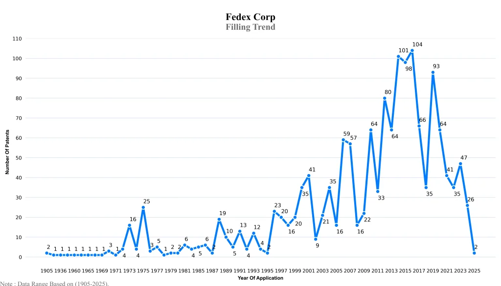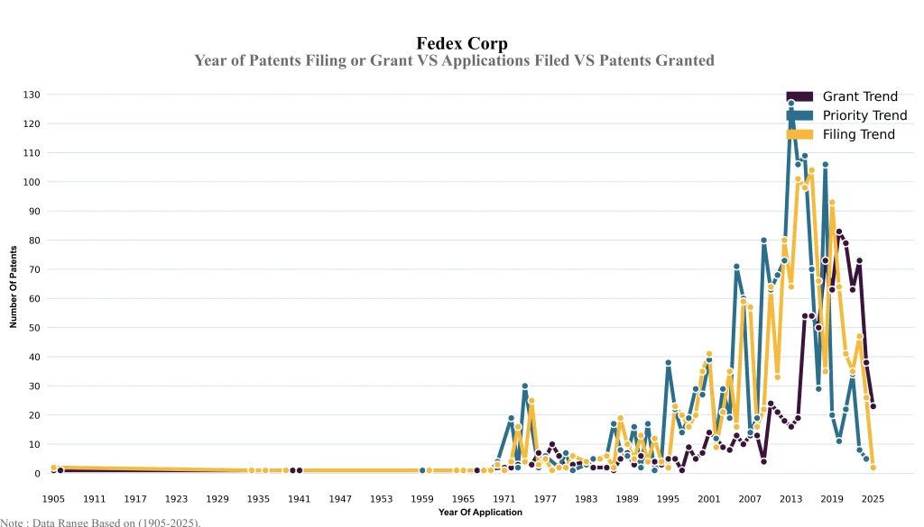 The below graphical representation indicates yearly filing trends of the Fedex Corp, which shows that the number of applications peaked in 2016 with 2023-2024 filings potentially still being recorded, indicating that the trend could rise further.