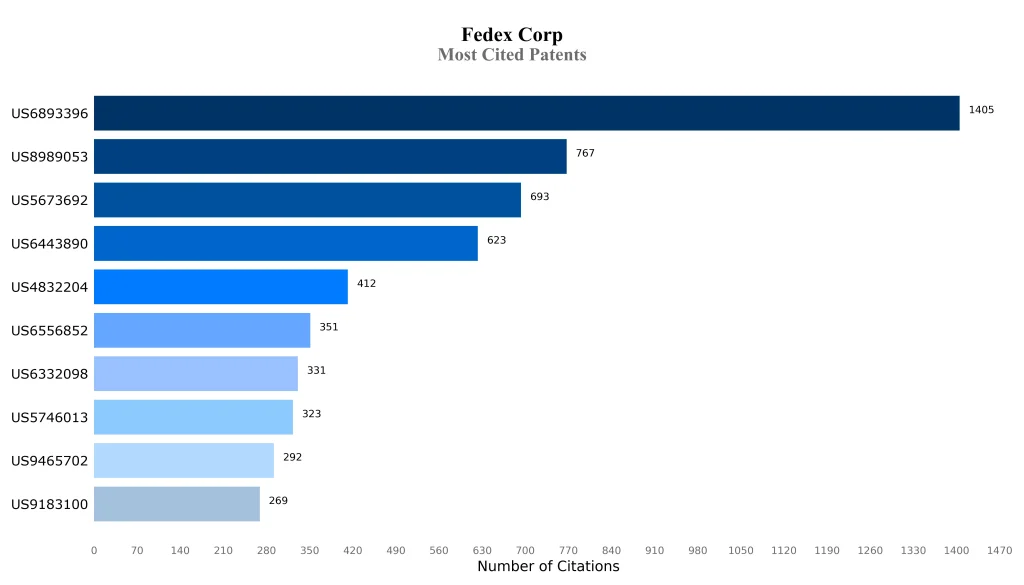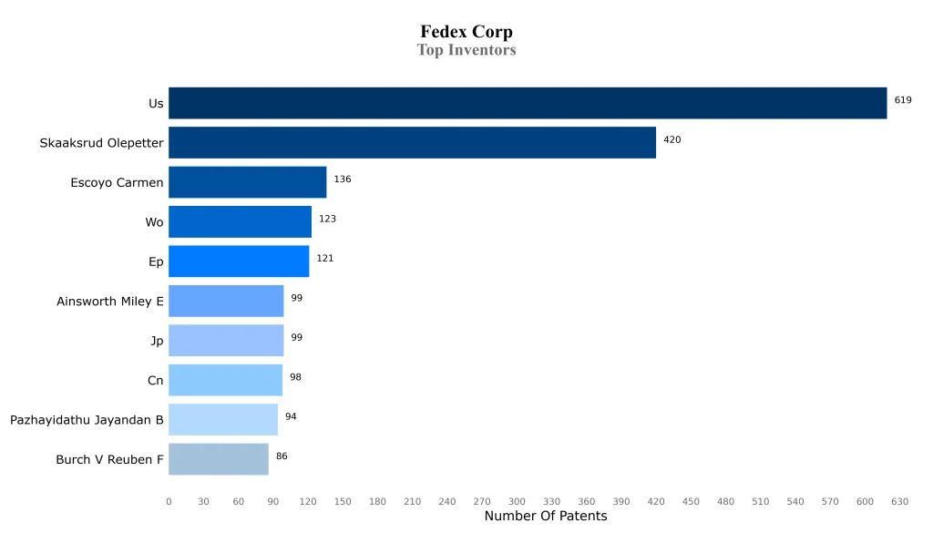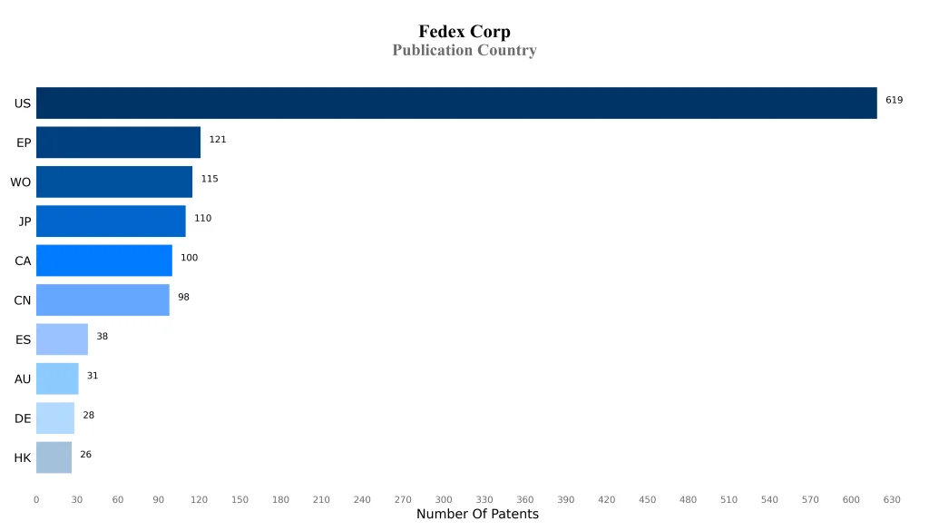 Fedex Corp along with its key subsidiaries has a total of around 1512 patents/applications globally as of the date of the instant publication, out of which 673 patents have been issued. Of these 1512 patents/applications, more than 54.3% patents/applications are active. United States is where Fedex Corp has filed the maximum number of patents, followed by European Patent Office.