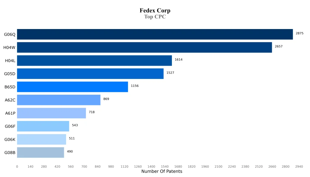 Most of the patents of the Fedex Corp are in the classification of G06Q and H04W, which indicates the core areas of technology focus of the company.