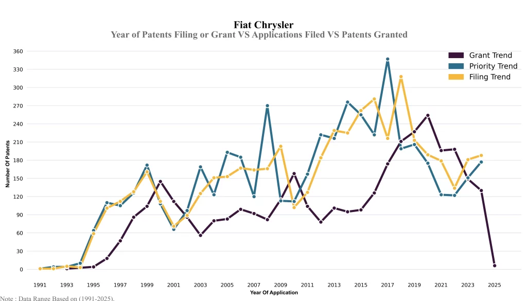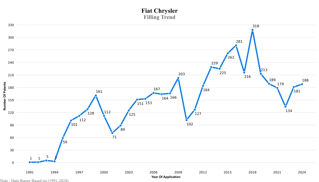The below graphical representation indicates yearly filing trends of the Fiat Chrysler, which shows that the number of applications peaked in 2018 with 2023-2024 filings potentially still being recorded, indicating that the trend could rise further.