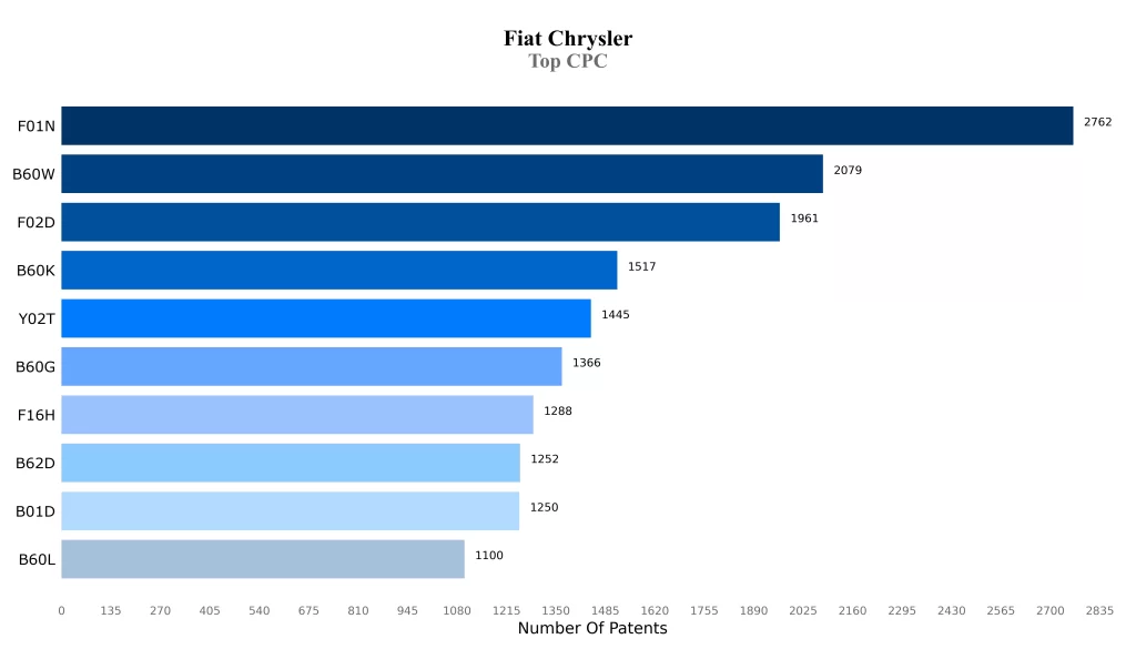 Most of the patents of the Fiat Chrysler are in the classification of F01N and B60W, which indicates the core areas of technology focus of the company.
