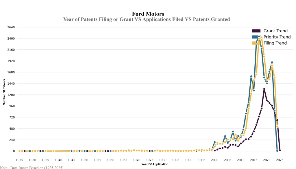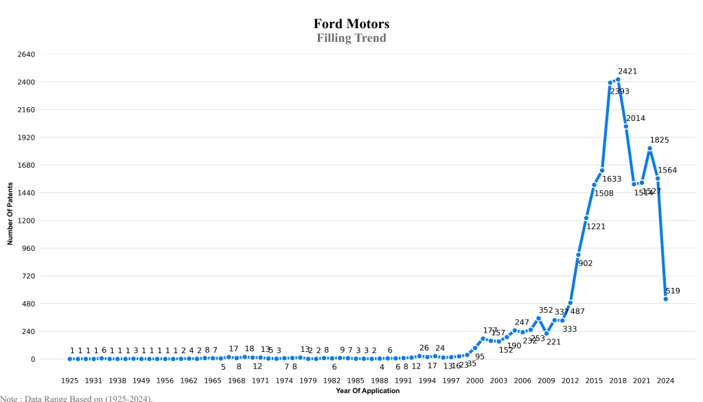 The below graphical representation indicates yearly filing trends of the Ford Motors, which shows that the number of applications peaked in 2018 with 2023-2024 filings potentially still being recorded, indicating that the trend could rise further.