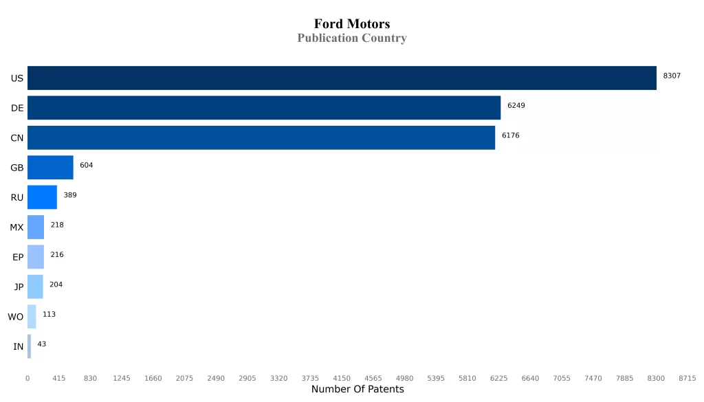 Ford Motors along with its key subsidiaries has a total of around 22659 patents/applications globally as of the date of the instant publication, out of which 7994 patents have been issued. Of these 22659 patents/applications, more than 75.13% patents/applications are active. United States is where Ford Motors has filed the maximum number of patents, followed by Germany.