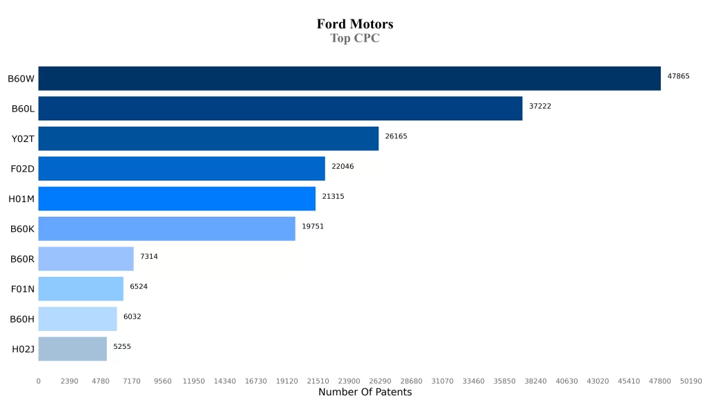 Most of the patents of the Ford Motors are in the classification of B60W and B60L, which indicates the core areas of technology focus of the company.