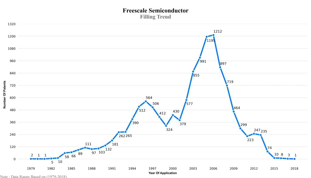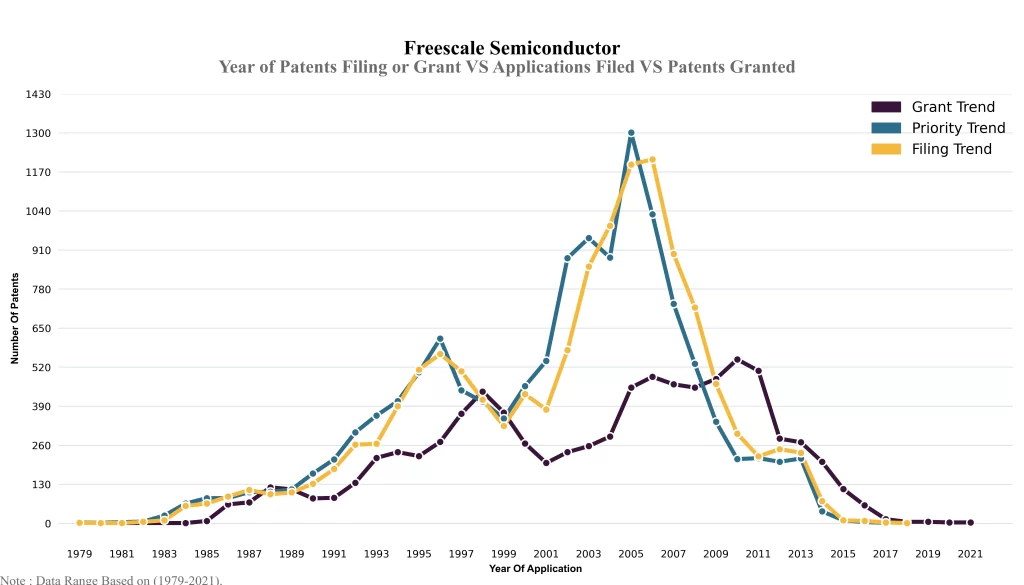 The below graphical representation indicates yearly filing trends of the Freescale Semiconductor, which shows that the number of applications peaked in 2006 with 2023-2024 filings potentially still being recorded, indicating that the trend could rise further.