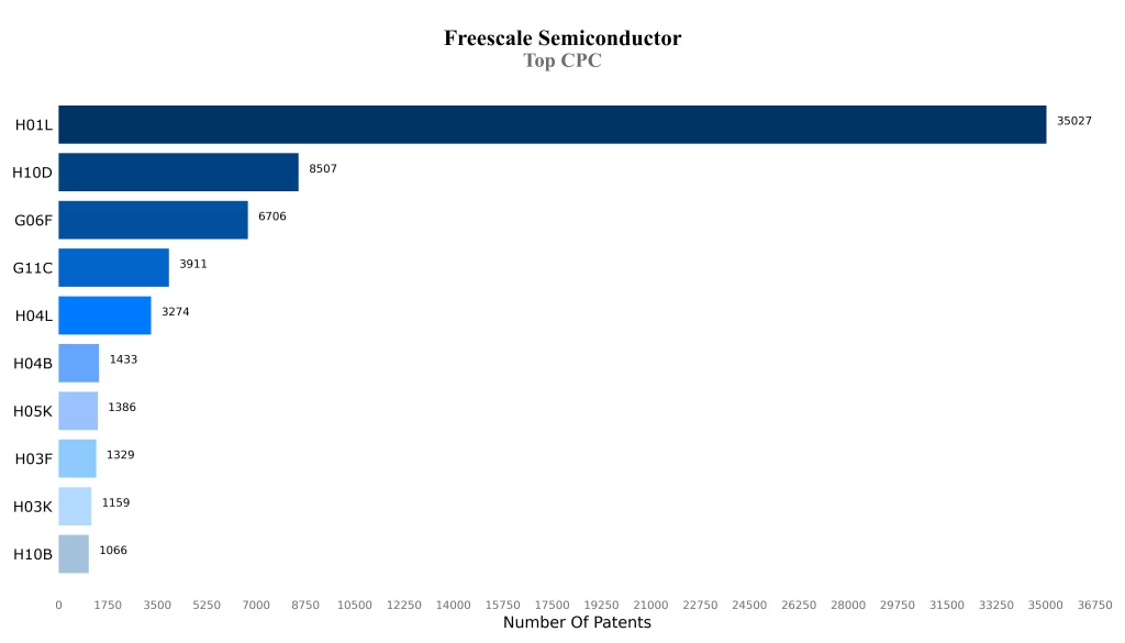 Most of the patents of the Freescale Semiconductor are in the classification of H01L and H10D, which indicates the core areas of technology focus of the company.