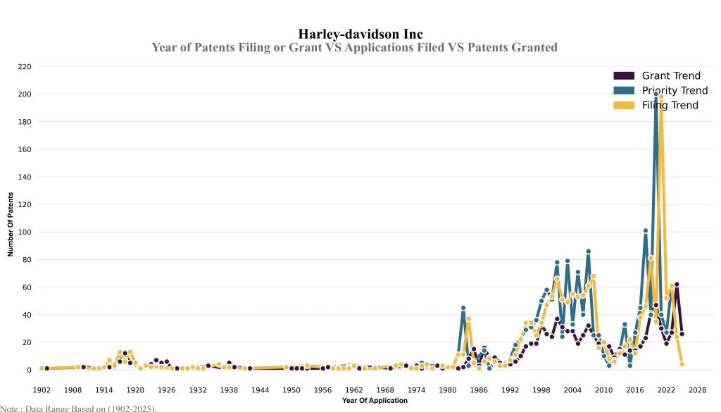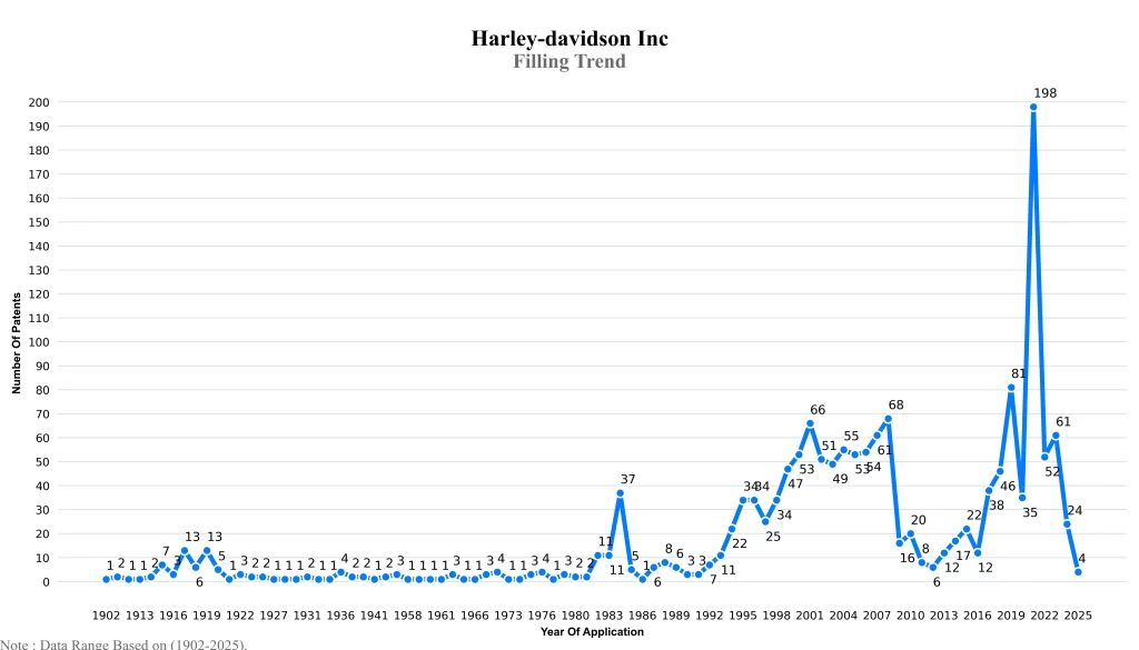 The below graphical representation indicates yearly filing trends of the Harley-davidson Inc, which shows that the number of applications peaked in 2021 with 2023-2024 filings potentially still being recorded, indicating that the trend could rise further.