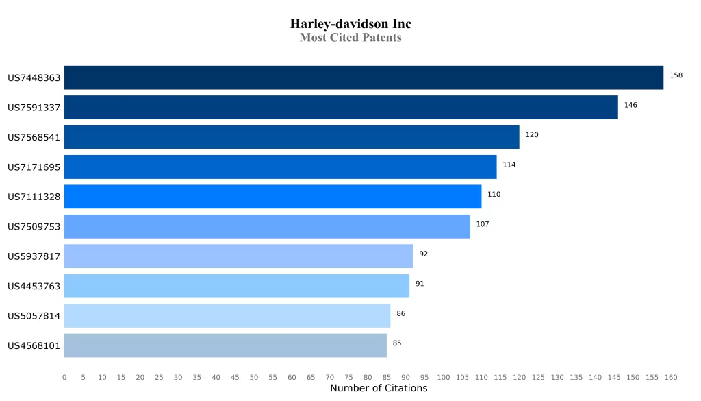 Harley-davidson Inc along with its key subsidiaries has a total of around 1585 patents/applications globally as of the date of the instant publication, out of which 338 patents have been issued. Of these 1585 patents/applications, more than 36.97% patents/applications are active. United States is where Harley-davidson Inc has filed the maximum number of patents, followed by Japan.