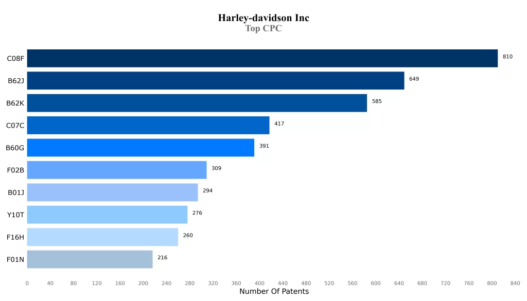 Most of the patents of the Harley-davidson Inc are in the classification of C08F and B62J, which indicates the core areas of technology focus of the company.
