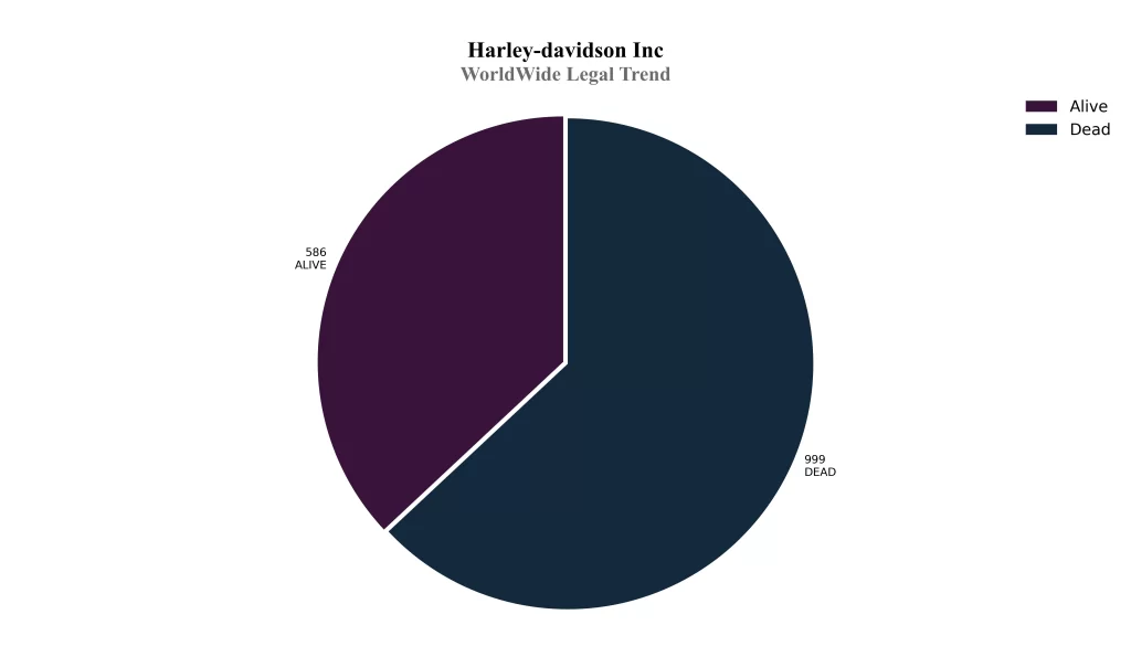 To continue further, Harley-davidson Inc has a total of 1585 patents/applications filed globally. These patents/applications belong to 716 unique patent families. Out of 1585, 586 patents/applications are active/pending and 999 patent/applications are inactive.