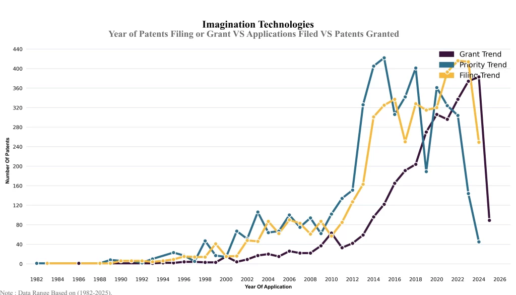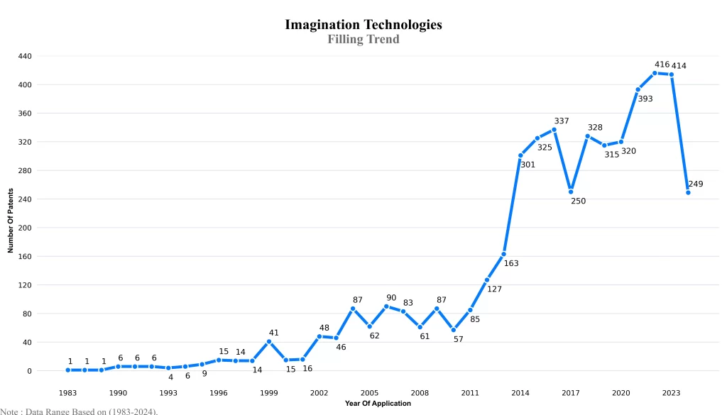 The below graphical representation indicates yearly filing trends of the Imagination Technologies, which shows that the number of applications peaked in 2022 with 2023-2024 filings potentially still being recorded, indicating that the trend could rise further.