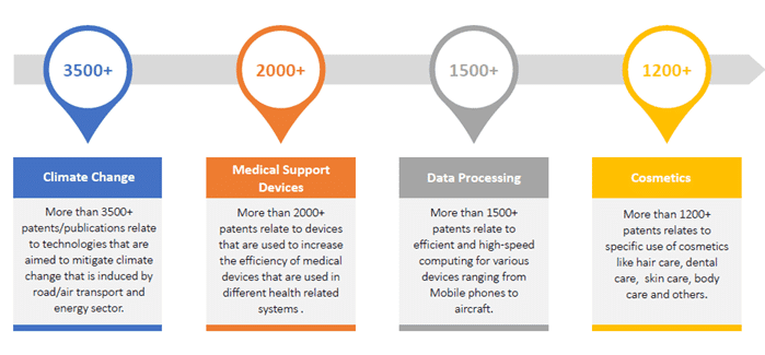Being a hub of air transport, energy and cosmetic sector, it is quite interesting to note that out of 30000+ patent families published in France since Jan 2020, more than 3500+ patents relates to inventions that are aimed to mitigate climate change. These inventions are primarily intended for transport in energy generation sectors.