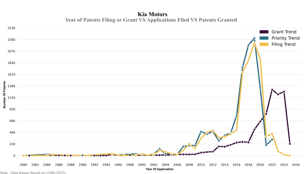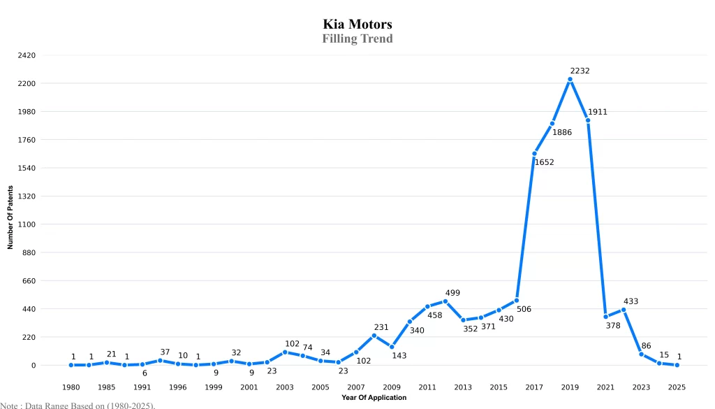 The below graphical representation indicates yearly filing trends of the Kia Motors, which shows that the number of applications peaked in 2019 with 2023-2024 filings potentially still being recorded, indicating that the trend could rise further.