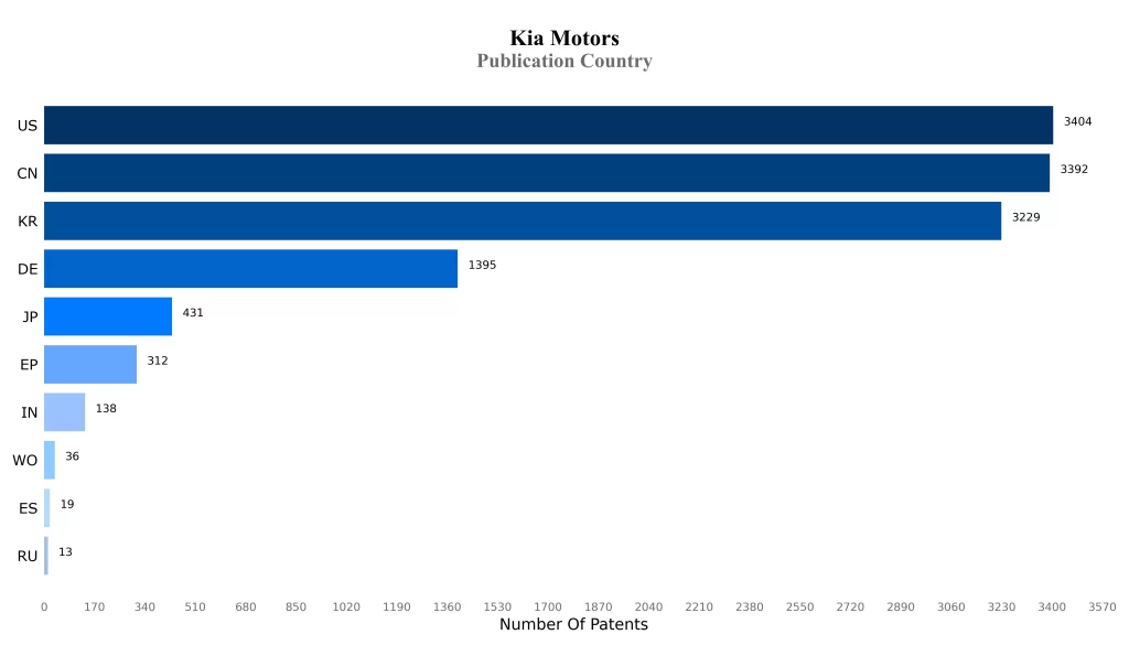 Kia Motors along with its key subsidiaries has a total of around 12410 patents/applications globally as of the date of the instant publication, out of which 7142 patents have been issued. Of these 12410 patents/applications, more than 78.21% patents/applications are active. United States is where Kia Motors has filed the maximum number of patents, followed by China.