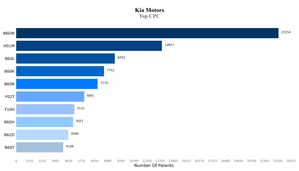 Most of the patents of the Kia Motors are in the classification of B60W and H01M, which indicates the core areas of technology focus of the company.